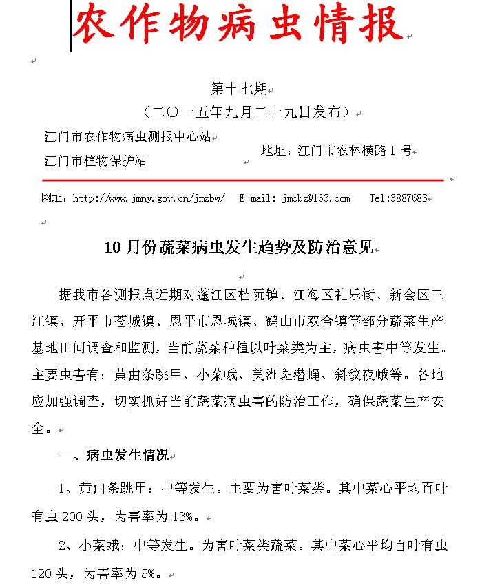 2015年农作物病虫情报第十七期(10月份蔬菜病虫发生趋势及防治意见)