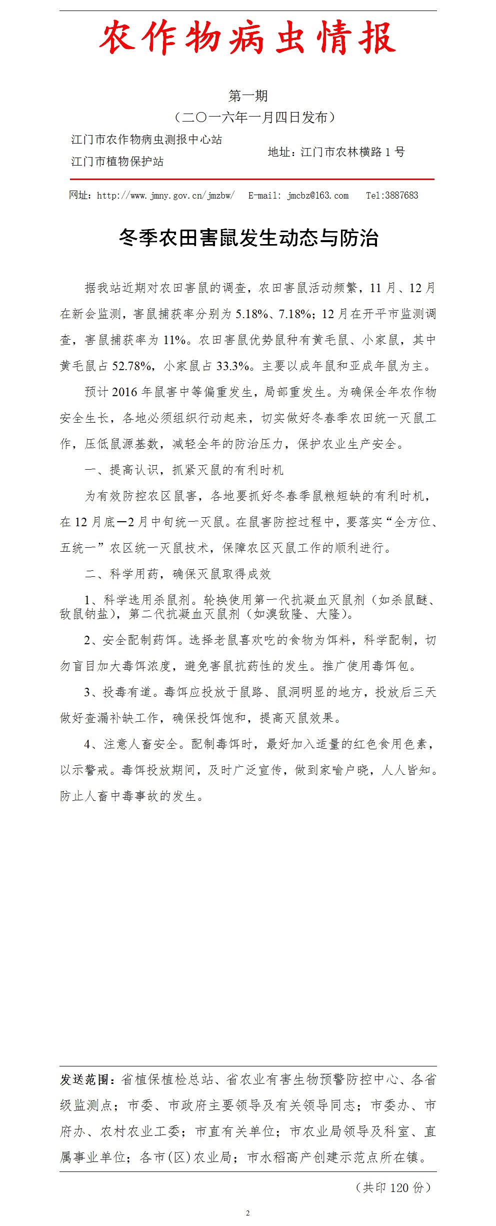 2016年农作物病虫情报第一期(冬季农田害鼠发生动态与防治)