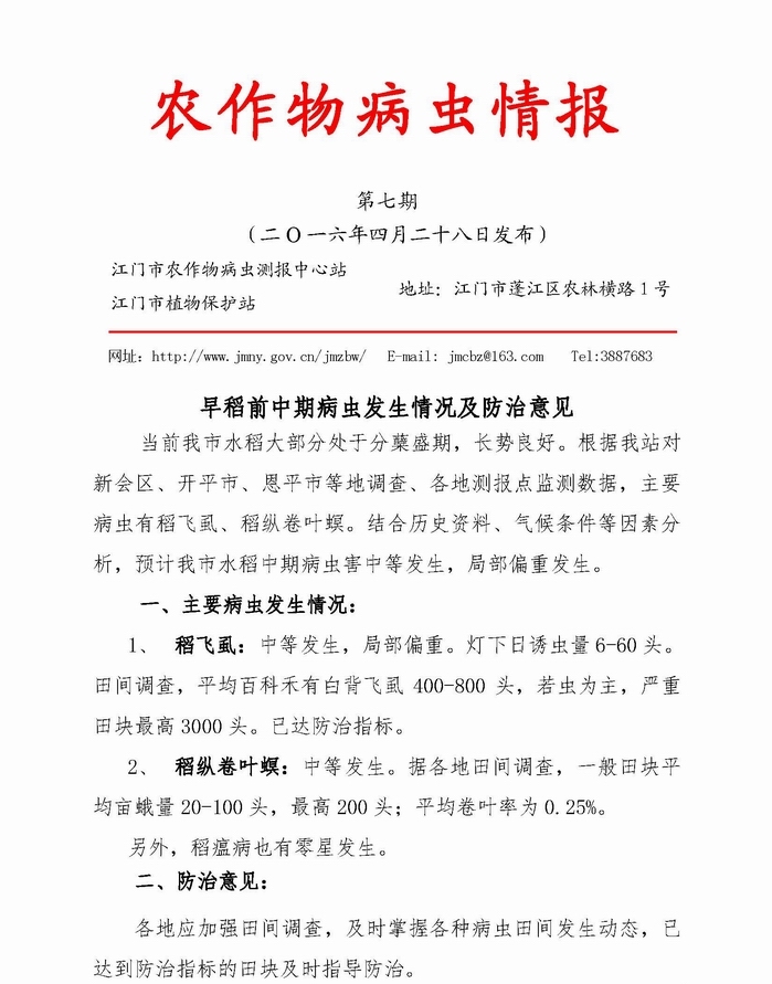 2016年农作物病虫情报 第七期