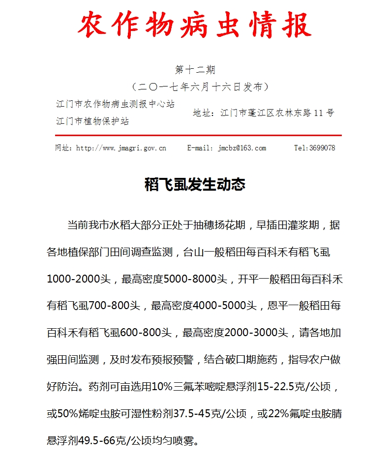 2017年开云电竞官方网站农作物病虫情报 第十二期(稻飞虱发生动态)