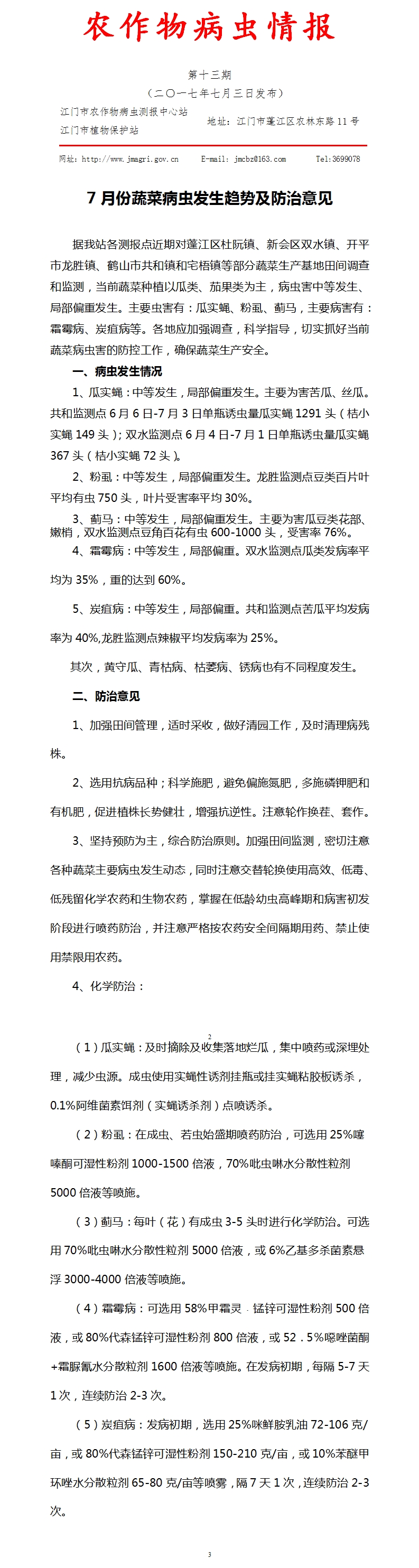 2017年开云电竞官方网站农作物病虫情报 第十三期(7月份蔬菜病虫发生趋势及防治意见)