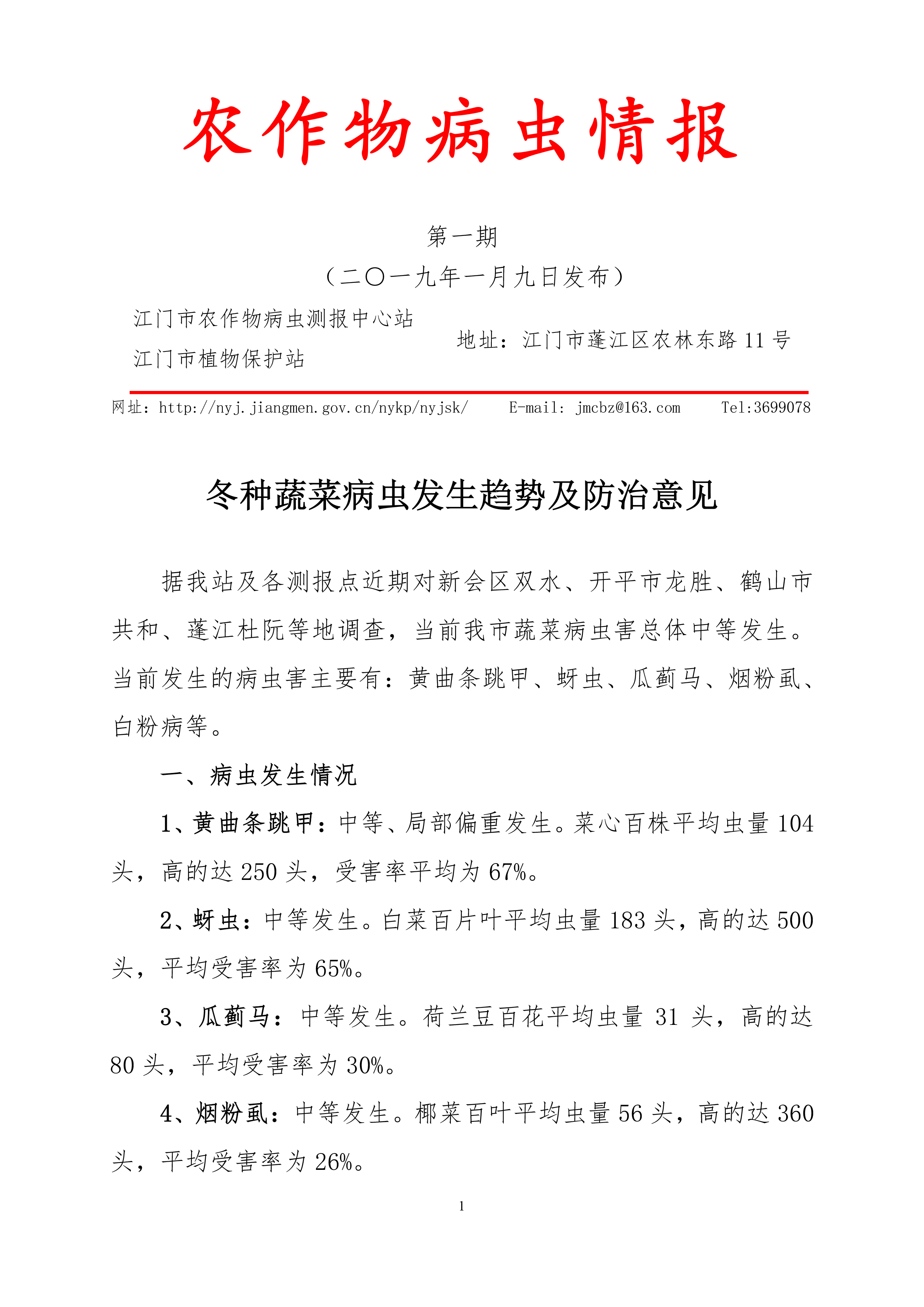江门2019农作物病虫情报(第一期)冬种蔬菜病虫发生趋势及防治意见