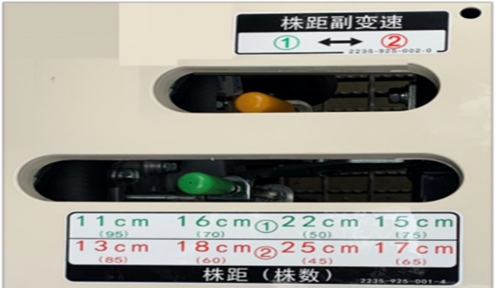 株距调节分为11、13、15、16、17、18、22、25cm八个挡位,由主、副株距调节手柄配合操作实现。