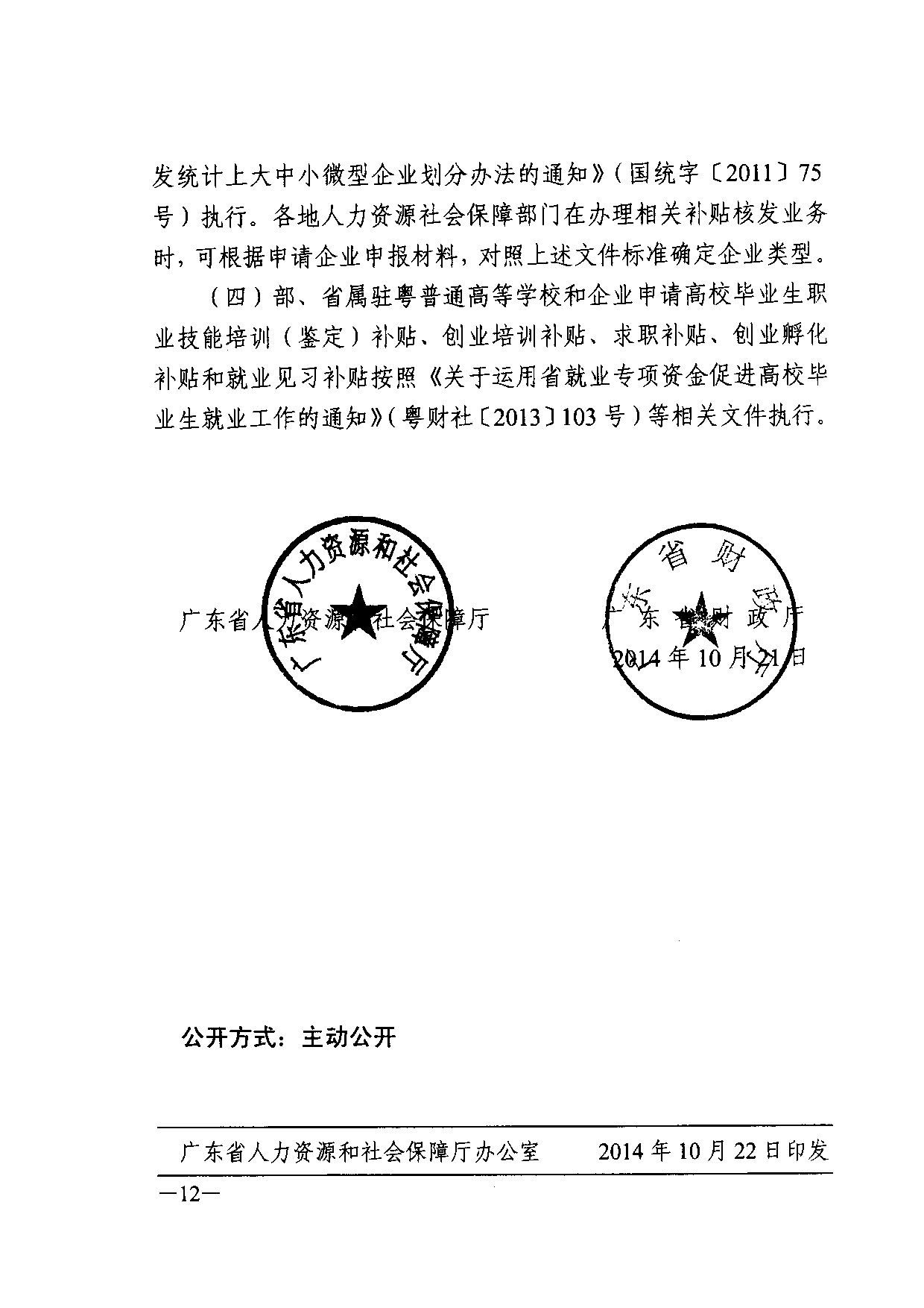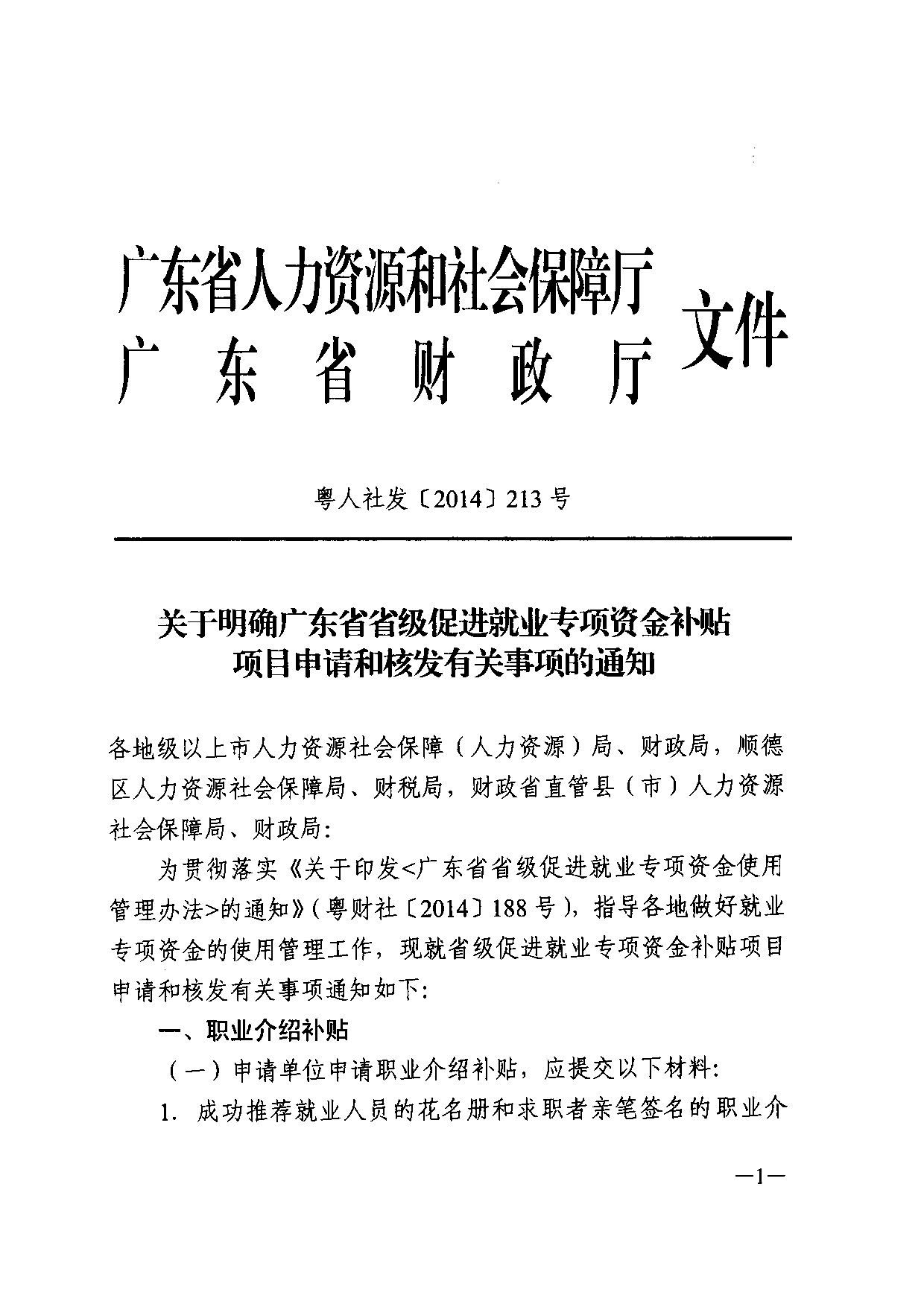 关于明确广东省省级促进就业专项资金补贴项目申请和核发有关事项的通知(粤人社发【2014】213号)