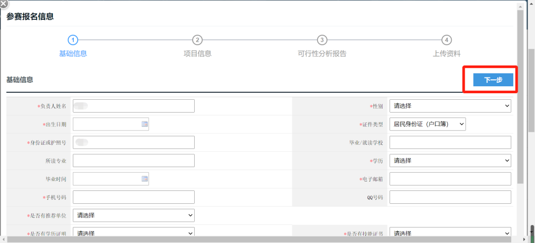 (十一)进入参赛报名信息填写界面,填写好第一部分“基础信息”后点击右上角【下一步】;