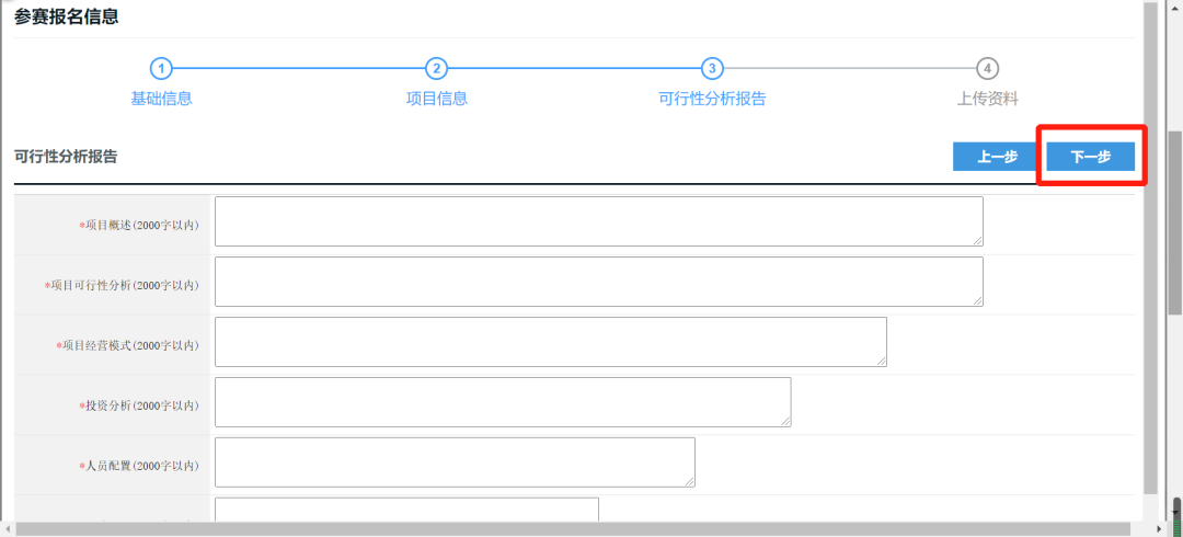 (十三)继续填写第三部分“可行性分析报告”,填写好后点击【下一步】;