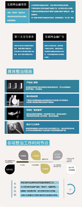 互联网金融活动跨领域、跨区域特征明显,专项整治提出运用多种措施,实现整治全面覆盖。一是运用“穿透式”监管方法,透过表面判定业务本质属性,根据业务实质执行相应的行为规则和监管要求。二是加强部门协作,相关部门建立数据交换和业务实质认定机制,必要时组成联合小组进行整治。三是加强金融管理部门和地方政府的协调配合,共同承担整治任务,共同落实整治责任。