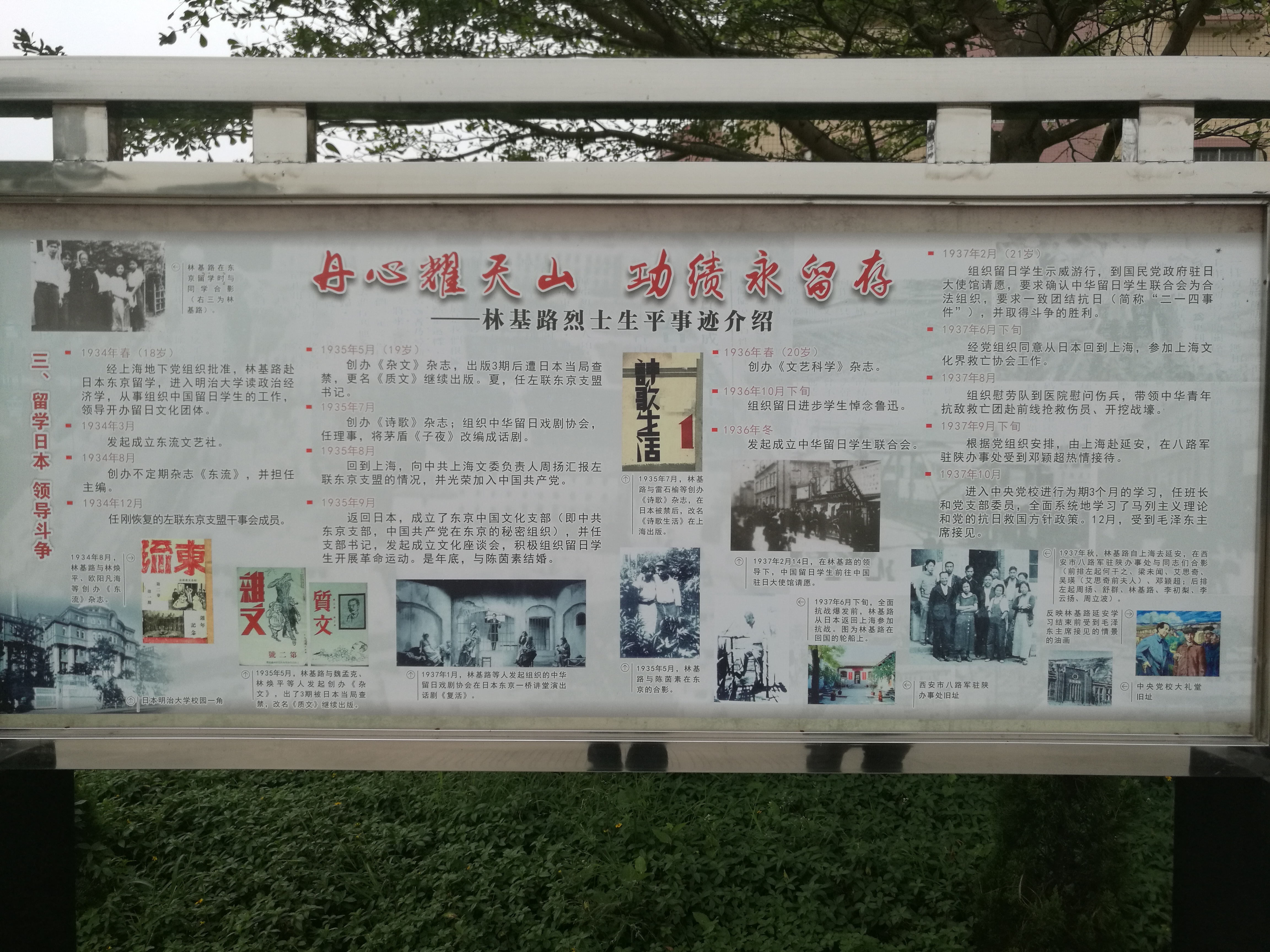 林基路同志的经历十分丰富,中学时期参加革命活动曾被捕入狱,18岁赴日留学,19岁在上海入党,21岁赴延安中央党校学习,22岁党派遣赴新疆做统战工作,历任新疆学院教务长,阿克苏专区教育局长,23岁任库车县县长,26岁任乌什县县长,27岁被军阀盛世才杀害,英勇就义。