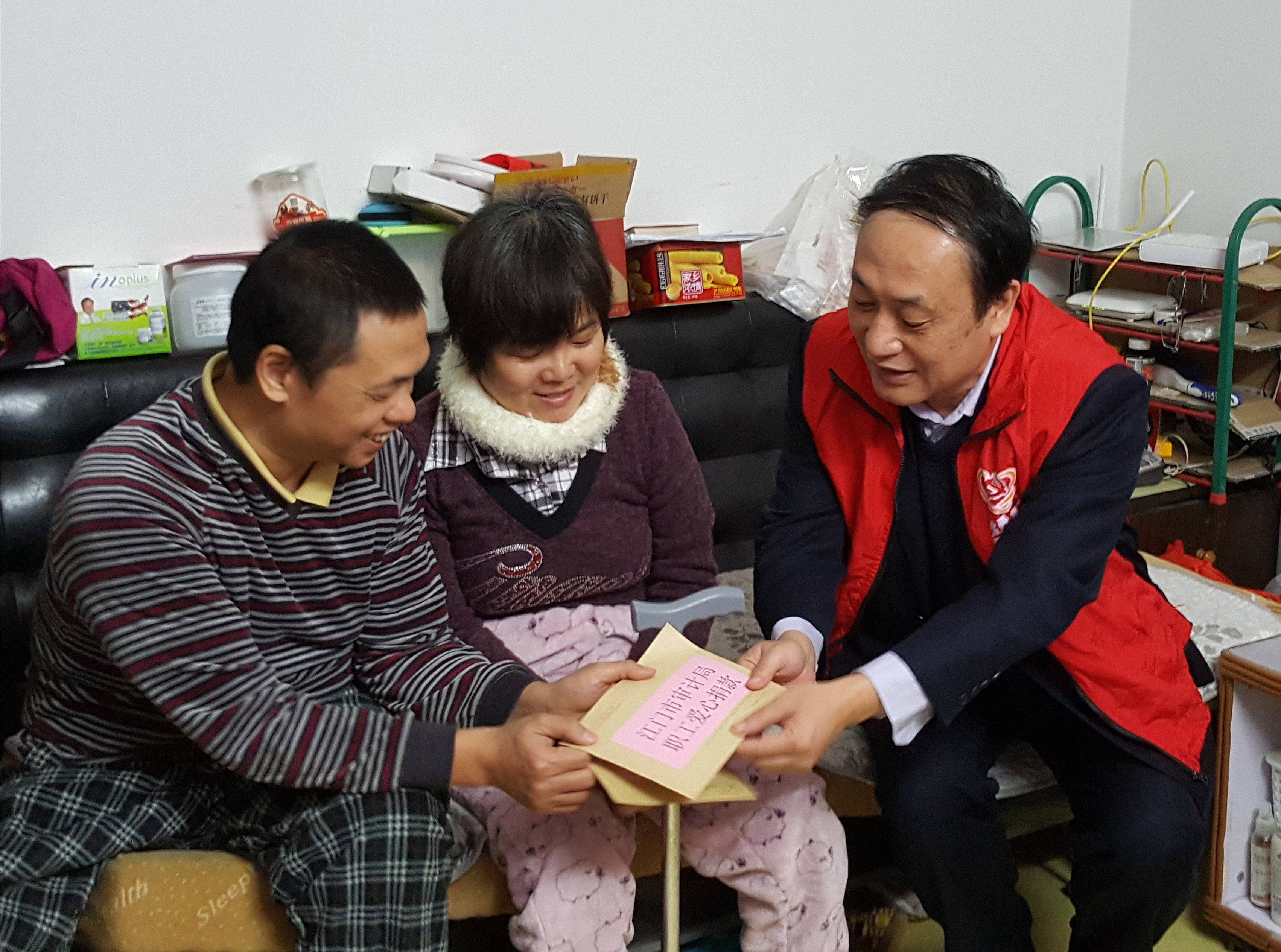 困难家庭的冷暖,时刻牵动着党委政府的心。林伟雄、凌健能同志带领党员义工去到残疾困难户赵汝江家。赵汝江一家五口人,有四位患有残疾,生活难以自理,全家靠其父亲每月2000多元的退休金生活。赵汝江的女儿目睹家庭的境况,决心通过自己双手帮助更多像她家庭的人,毅然选择并考取了药科大学康复治疗专业就读,但只能通过勤工俭学勉强支撑学业。市审计局党支部得知赵汝江一家的困难情况后,郭建红局长带头,在局内开展慈善募捐活动,筹得助学金三千多元。