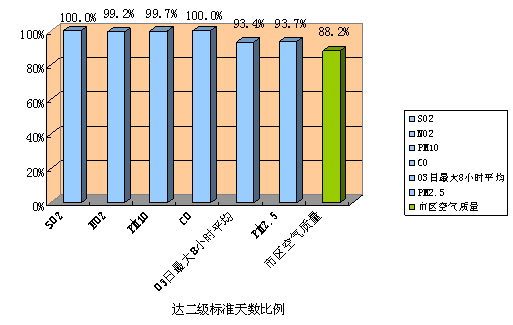 2015年,开云电竞官方网站二氧化硫平均浓度为16微克/立方米(年均值二级标准为60微克/立方米),较去年下降33.3%;二氧化氮平均浓度为31微克/立方米(年均值二级标准为40微克/立方米),较去年下降3.1%;可吸入颗粒物(PM10)平均浓度为50微克/立方米(年均值二级标准为70微克/立方米),较去年同期下降21.9%;细颗粒物(PM2.5)平均浓度为34微克/立方米(年均值二级标准为35微克/立方米),较去年同期下降22.7%;臭氧日均浓度(最大8小时均值第90百分位数)为146微克/立方米,较去年上升1.4%;一氧化碳日均浓度(第95百分位数浓度)为1.5毫克/立方米,较去年下降25.0%。