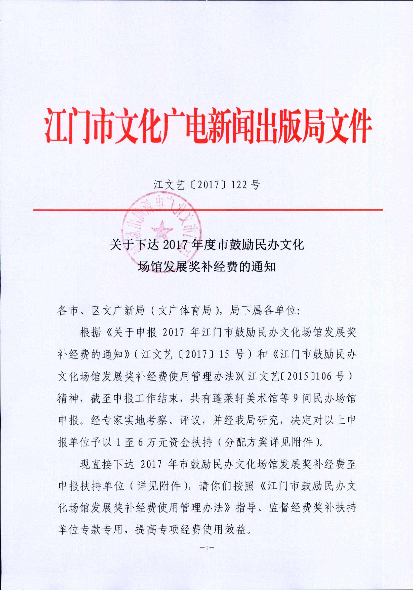 【文件】关于下达2017年度市鼓励民办文化场馆发展奖补经费的通知(江文艺〔2017〕122号)