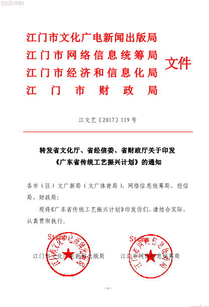 【文件】转发省文化厅、省经信委、省财政厅关于印发《广东省传统工艺振兴计划》的通知(江文艺〔2017〕119号)