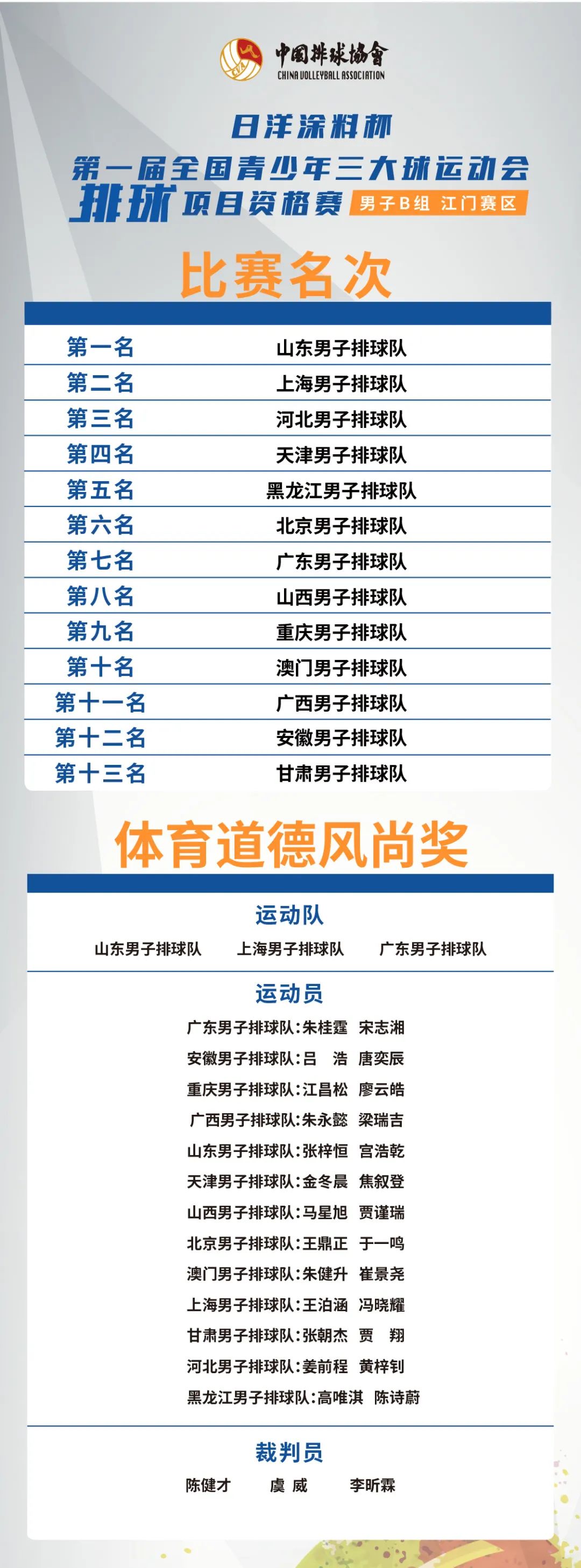 至此,日洋涂料杯·第一届全国青少年三大球运动会排球项目资格赛男子B组(江门赛区)最终成绩出炉。公告如下: