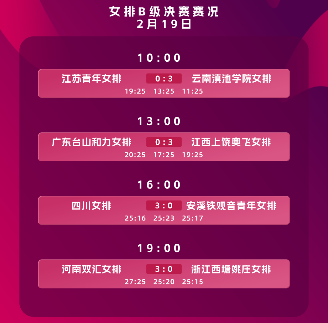 在19日女子的四场比赛中,云南滇池学院女排三比零胜江苏青年女排,江西上饶奥飞女排三比零赢广东台山和力女排,四川女排三比零赢福建安溪铁观音青年女排。晚上七点的比赛中,河南双汇女排对浙江西塘姚庄女排,一开局比分交替上升,经过激烈的争夺,河南队以27比25拿下第一局,乘胜追击,一鼓作气三比零拿下比赛。