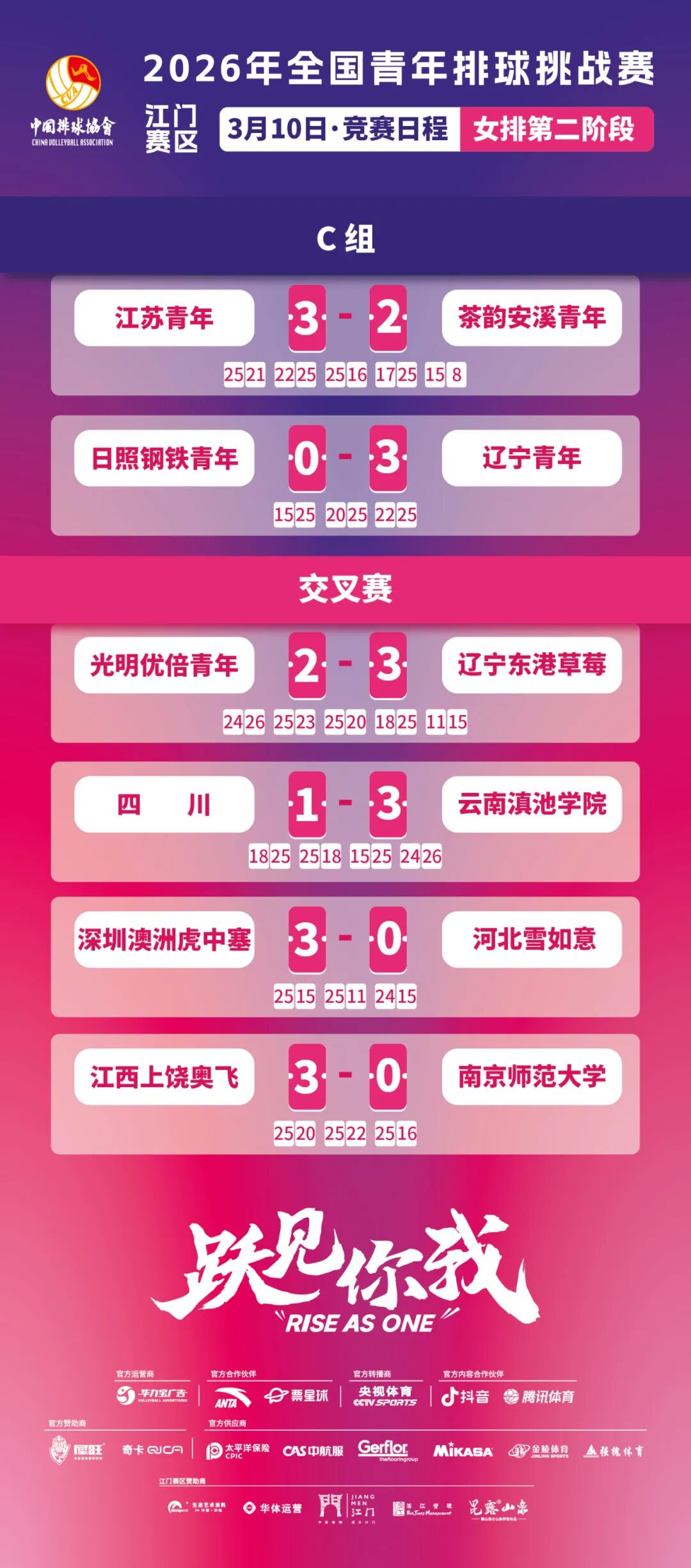 今日首先开打的两场比赛将赛事的白热化推向极致!两场比赛双双鏖战至决胜的第五局,最终江苏青年以3比2战胜茶韵安溪青年。辽宁东港草莓以3比2战胜光明优倍青年,成为第一支进入四强的队伍。