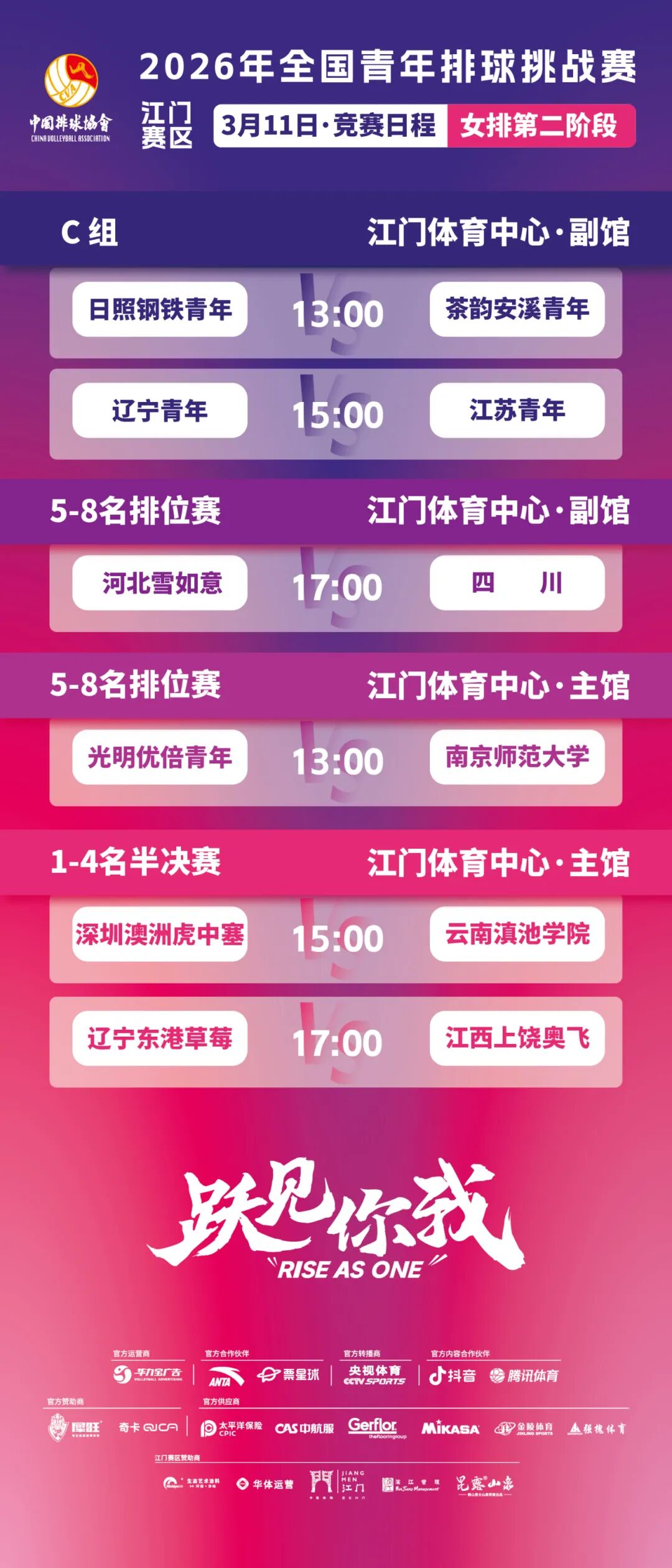 2026年全国青年排球挑战赛(江门赛区)于2026年3月4日至14日在江门体育中心体育馆举行。本次赛事由国家体育总局排球运动管理中心主办,开云电竞官方网站文化广电旅游体育局、江门滨江华体体育会展中心有限公司承办,开云电竞官方网站蓬江区文化广电旅游体育局协办。