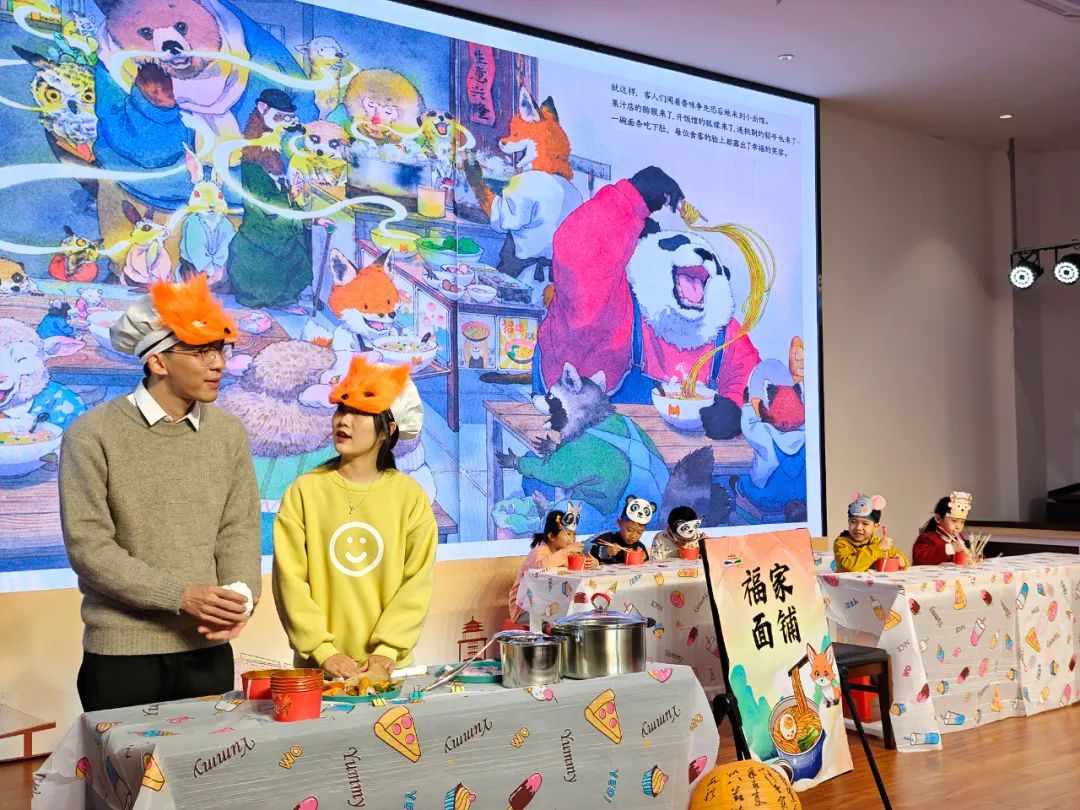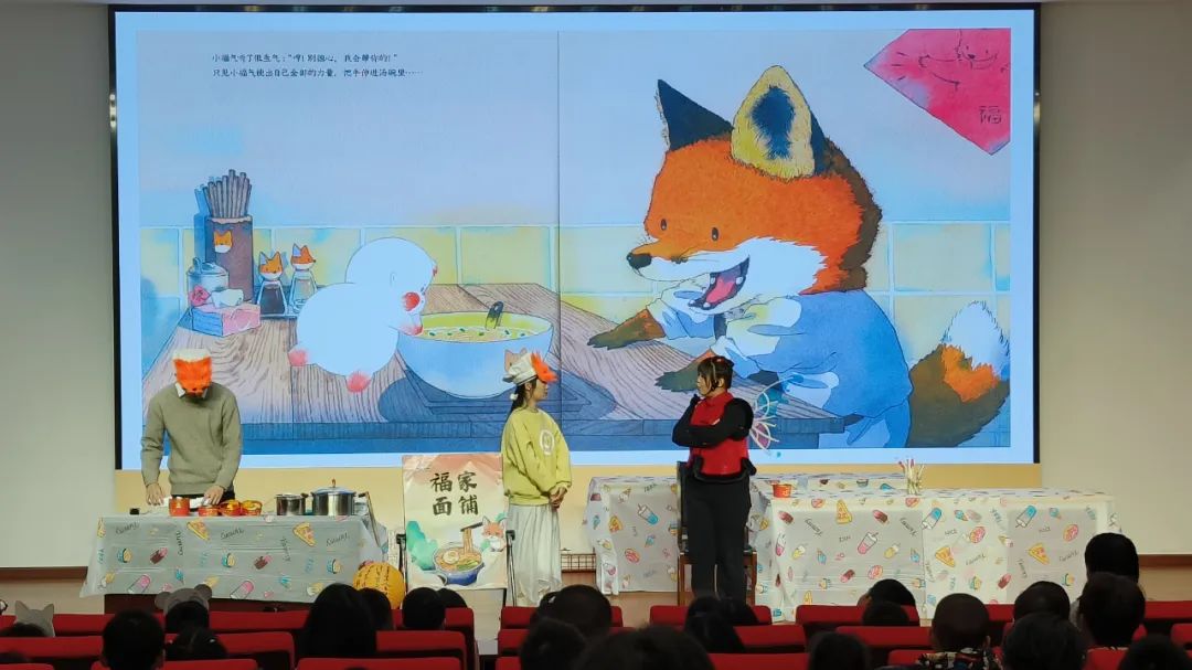 舞台上,演员们凭借精彩的表演和丰富多样的道具,将绘本中的世界栩栩如生地呈现在观众眼前。那憨态可掬、宛如娃娃的“小福气”,萌系十足、橘黄面庞搭配暖黄色大耳朵且手端面碗的小狐狸,以及灯笼、福字贴纸等节日元素,无不让人仿佛置身于绘本的奇妙情境之中。
