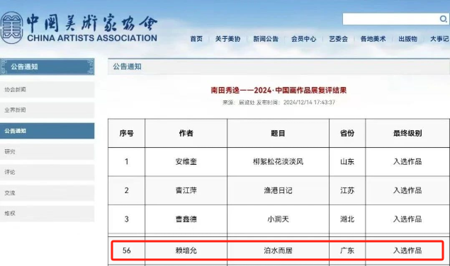 2024年12月14日,由中国美术家协会、 中共常州市委宣传部主办的“南田秀逸——2024·中国画作品展”复评工作结束。经专家评审,最终评出196件入展作品,开云电竞官方网站美术家赖培允的作品成功入选本次展览。