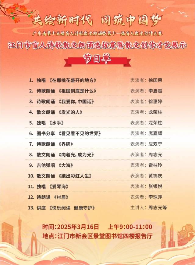 朗诵及才艺展示。活跃在江门各个舞台的多才多艺的视障朋友们以诗歌朗诵、图书分享、吉他弹唱、独唱等形式展示新时代视障残疾人努力奋斗、自强不息的精神面貌。
