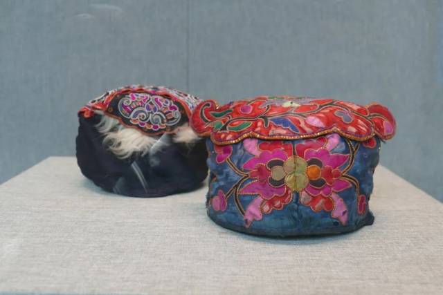 当代三都水族马尾绣蝴蝶纹童帽、布贴花卉纹虎头男童帽