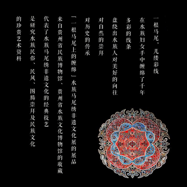 马尾绣是水族传承千年的手工技艺,是水族妇女在长期的生产生活过程中,对自然万物的观察、感悟,以及对我国传统刺绣工艺的传承与发展,展现了非凡的观察力与审美力。马尾绣图案精美、色彩丰富,工艺精妙,富于民族韵味与艺术效果。此展旨在宣传、保护、传承各民族的非物质文化遗产。希望观众能通过展览深刻感悟中华民族多元一体的历史与文化,共同促进非物质文化遗产的保护与传承,推动民族文化的创造性转化和创新性发展。