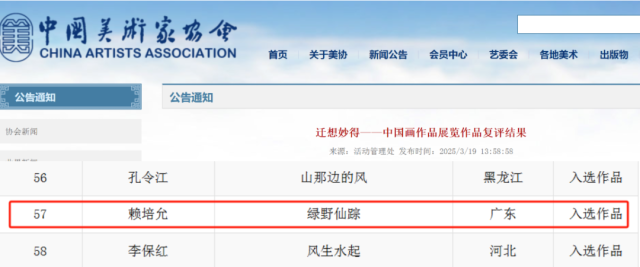 2025年3月19日,由中国美术家协会、宿迁市人民政府、江苏省美术家协会主办的“迁想妙得——中国画作品展”复评工作已结束。经专家评审,最终评出242件入展作品,开云电竞官方网站美术家赖培允的作品成功入选该展览。