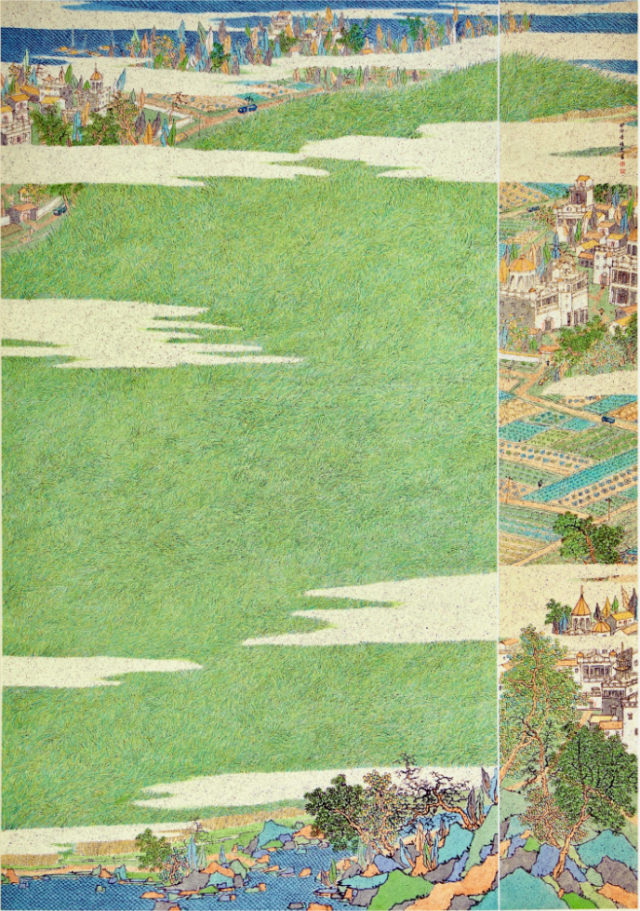 作品表现的是甘蔗长成后充满奇幻色彩的天地。甘蔗如身着绿衣的卫士,整齐排列,随风摇曳;甘蔗林沙沙作响,似在低语着神秘的故事。修长的甘蔗茎杆,在阳光照耀下闪烁着黄龙玉般的光泽。不远处是农舍村庄,有错落的房舍,烟囱中升腾起袅袅炊烟。农用车在马路上来回奔波,大人们在地里田间劳作,孩童们在村间嬉笑奔跑,犬吠声此起彼伏。甘蔗林与农舍村庄交织,构成如“绿野仙踪”般的画卷,洋溢着质朴的生活气息,让人沉醉在远离尘嚣的悠然之中。为创作甘蔗系列作品,作者亲临朋友的农场采风并体验种蔗的过程,产生灵感后创作出此《绿野仙踪》作品。