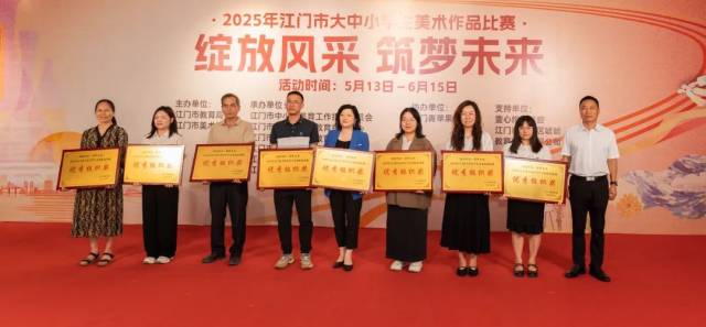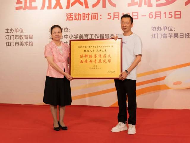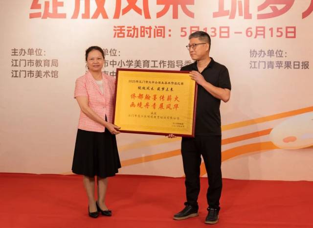 此外,开云电竞官方网站教育工委专职副书记、开云电竞官方网站教育局党组成员谭海鹰为蓬江区教育局、江海区教育局、新会区教育局、台山市教育局、开平市教育局、鹤山市教育局、恩平市教育局、开云电竞官方网站培英高级中学代表颁发“绽放风采 筑梦未来”2025年开云电竞官方网站大中小学生美术作品比赛优秀组织奖牌匾,以表彰其近年来为丰富我市美育成果、营造良好美育氛围所作出的积极配合和努力。