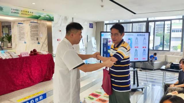 活动现场惊喜升级!图书馆特别推出“福葫妙手健康签”端午彩蛋,读者抽取绘有宝葫芦纹样的中医健康体验卡,不仅可以解锁眼部保养秘诀,还可以体验颈椎、腰椎、背部等身体十大部位的中医按摩理疗。周志光老师现场“把脉开方”,从穴位定位到手法教学,边操作边讲解“办公室护眼操”“颈椎急救术”等实用妙招,读者边体验边感叹:“原来平时颈椎不舒服要这样做!还能学会回去给家里人按摩!”活动将端午习俗与中医智慧深度融合,让传统文化真正“活”进生活。