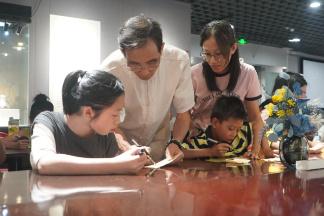 国家级代表性传承人廖惠林老师边用特制的电烙笔演示烙画工艺边讲解:“葵扇老叶纤维紧密,烙画时温度要像握毛笔般‘悬腕控力’—— 温度低了线条模糊,温度高了则会灼穿叶脉。”廖老师穿梭在学员之间,不时俯身指导。他握住一位学员的手,轻声说道:“别着急,就像写毛笔字,起笔要稳,运笔要匀。” 说着,他以腕力轻转笔锋,用虚笔烙出渐变肌理,原本普通的书签瞬间仿佛蒙上了一层朦胧的诗意。在老师的指导下,大家渐渐掌握了技巧。有人尝试烙制花鸟图案,先小心翼翼地勾勒轮廓,再用点烙的方式表现羽毛和花瓣的质感;有人挑战书法题字,一笔一画间,焦黄色的字迹逐渐在葵叶上清晰浮现。一名学员捧着自己初次完成的烙画书签,眼中满是惊喜:“以前只知道葵扇消暑,现在才明白每一道焦痕都是‘草木与火焰的共舞’—— 你得顺着它的纤维走向,它才会在高温下绽放出独有的纹路。”