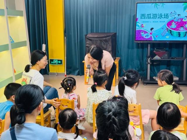 故事中,小熊、小老鼠等小动物们在切开的大西瓜里游泳、嬉戏,清凉的西瓜汁、甜甜的果肉,构成了一个梦幻般的游泳场。老师生动的讲述、丰富的表情和惟妙惟肖的模仿,让孩子们仿佛身临其境,眼睛里闪烁着好奇与兴奋的光芒。家长们也被故事吸引,脸上洋溢着微笑,不时与身边的孩子轻声交流。