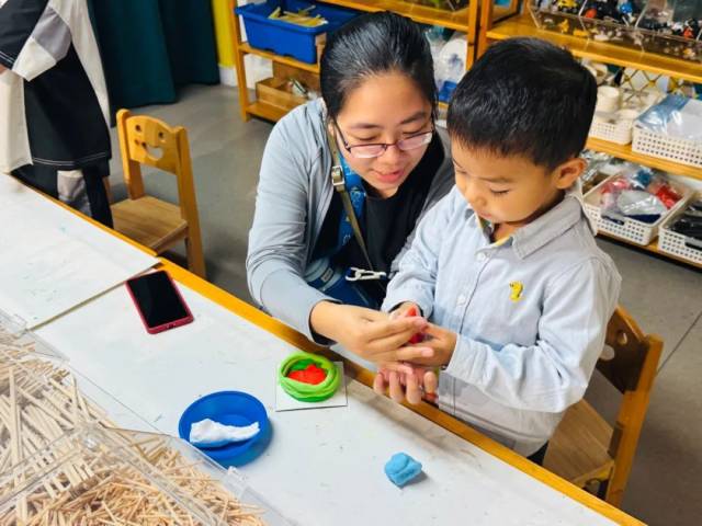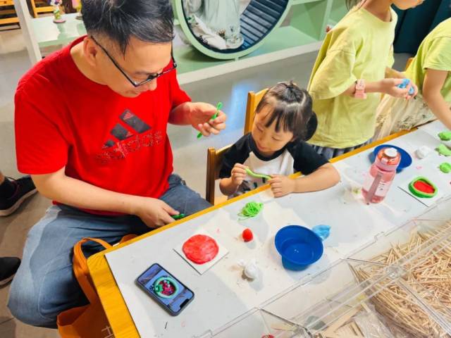 随后,亲子互动环节将活动推向了高潮。老师为每个家庭发放了手工材料,家长和孩子们一起动手,制作属于自己的 “西瓜游泳场”。孩子们发挥着无限的创意,用黏土捏出西瓜游泳场的形状,再捏出小动物,将它们组合在一起。有的孩子给西瓜游泳场加上了彩色的滑梯,有的为小动物们设计了漂亮的泳衣,现场充满了欢声笑语。