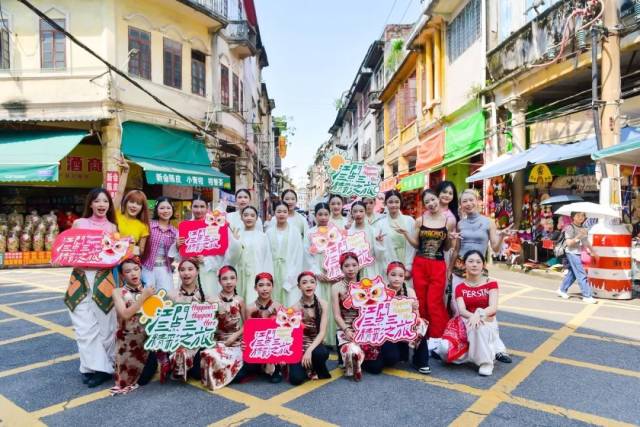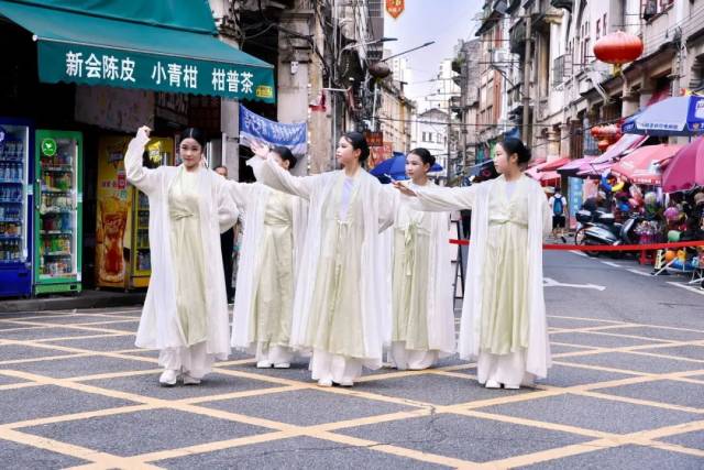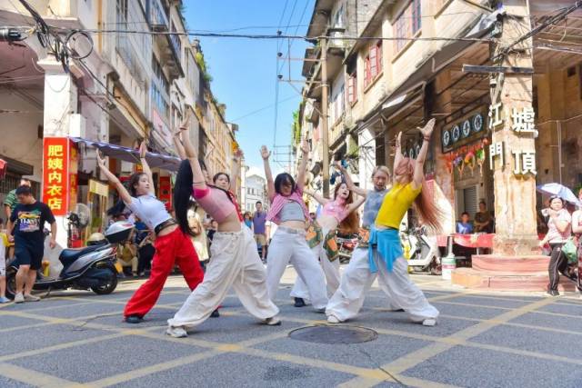 下午3:15分,身着各式精致服饰的年轻舞者们以街舞为媒,开启了一场时空对话。《上官婉儿》以现代肢体语言重构古典气韵,刚柔并济;《先生,我想写封信给你》则巧妙融合书信文化情怀,在动感中流淌深情;《大展宏图》以恢弘气势点燃现场,传递奋进力量;《行进音乐》更将表演化为流动的风景,舞者与市民、游客在骑楼街巷穿行互动,青春律动与历史光影交织共鸣。