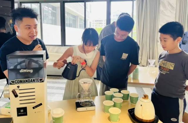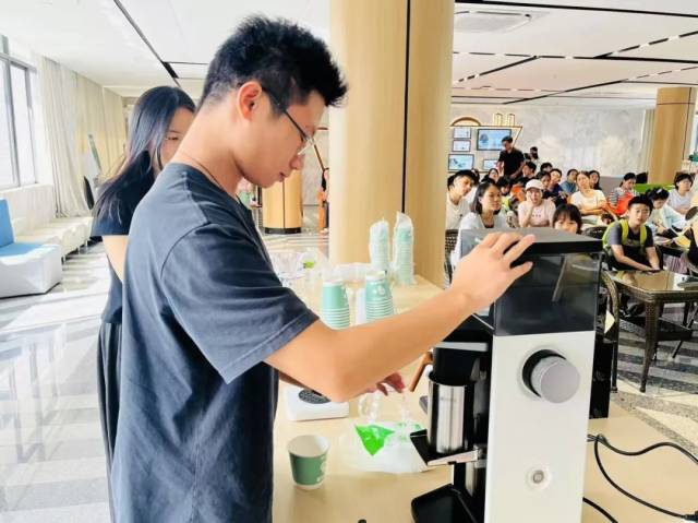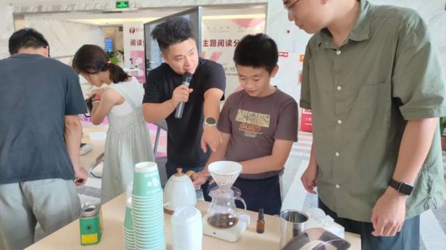 邑轮咖啡豆烘焙工厂主理人容国栋老师则聚焦咖啡品鉴艺术,详解手冲咖啡核心技巧,生动讲解并演示“因豆施策”的咖啡冲泡智慧,并且现场邀请市民读者一起体验不同豆种冲泡咖啡的方法,市民读者积极参与制作,还品鉴到不同口味的咖啡,获得了非凡的体验。