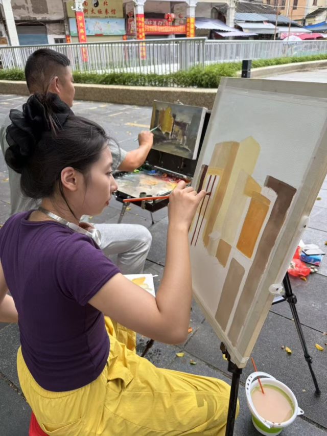 参与者分赴水埗头、长堤骑楼等多个核心地标进行沉浸式创作,共完成油画、水彩等作品70余幅。画作生动捕捉了骑楼的百年风韵、水埗头石阶的岁月印痕,以及沿江建筑的中西合璧特色,成为了侨乡文化的鲜活艺术载体,为第五届江门艺术季“三十三艺术墟”增添浓墨重彩的一笔。