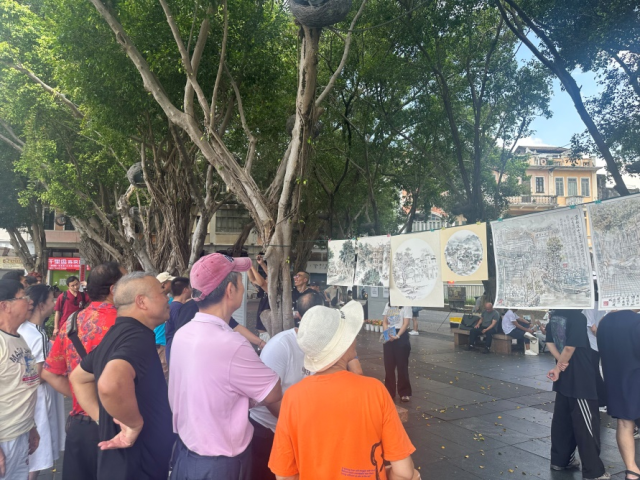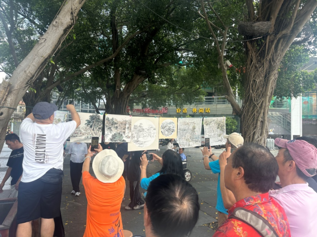 本次活动写生作品在长堤青年广场上进行展示,画家们和市民群众驻足观赏,拿起手里的相机拍照留念