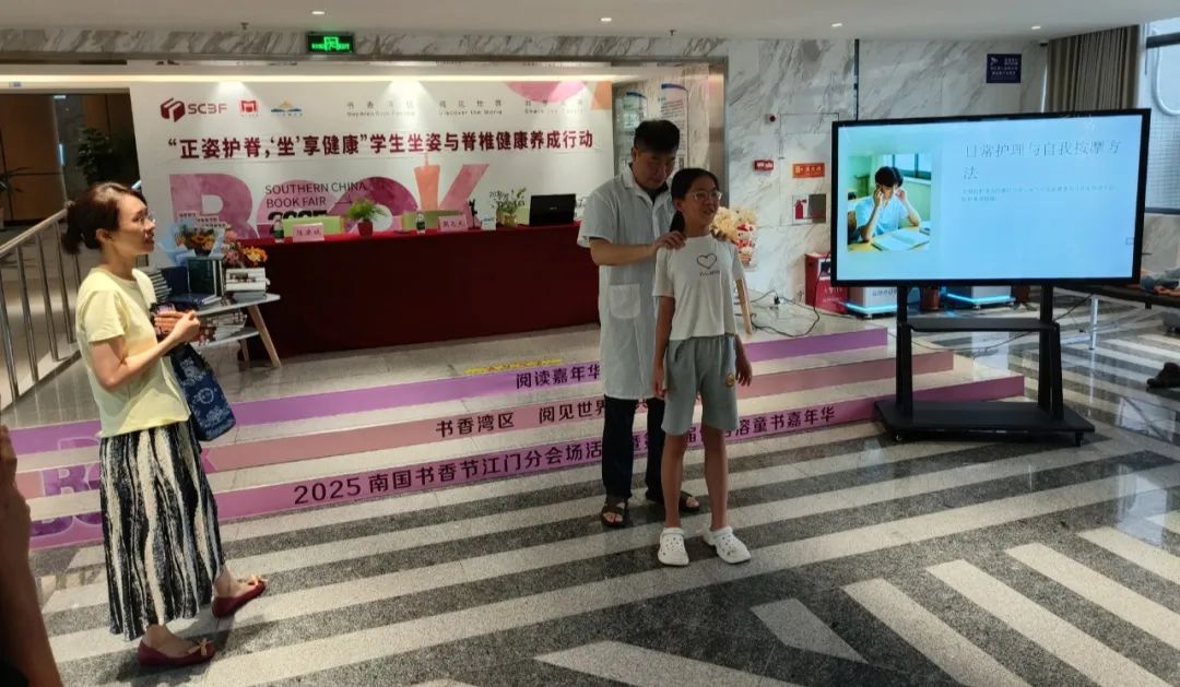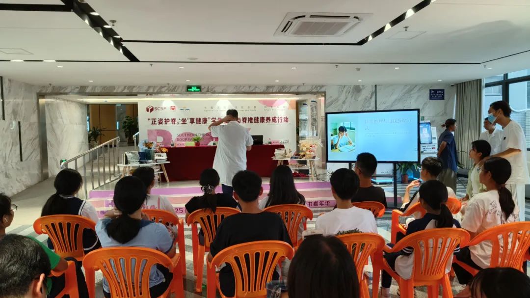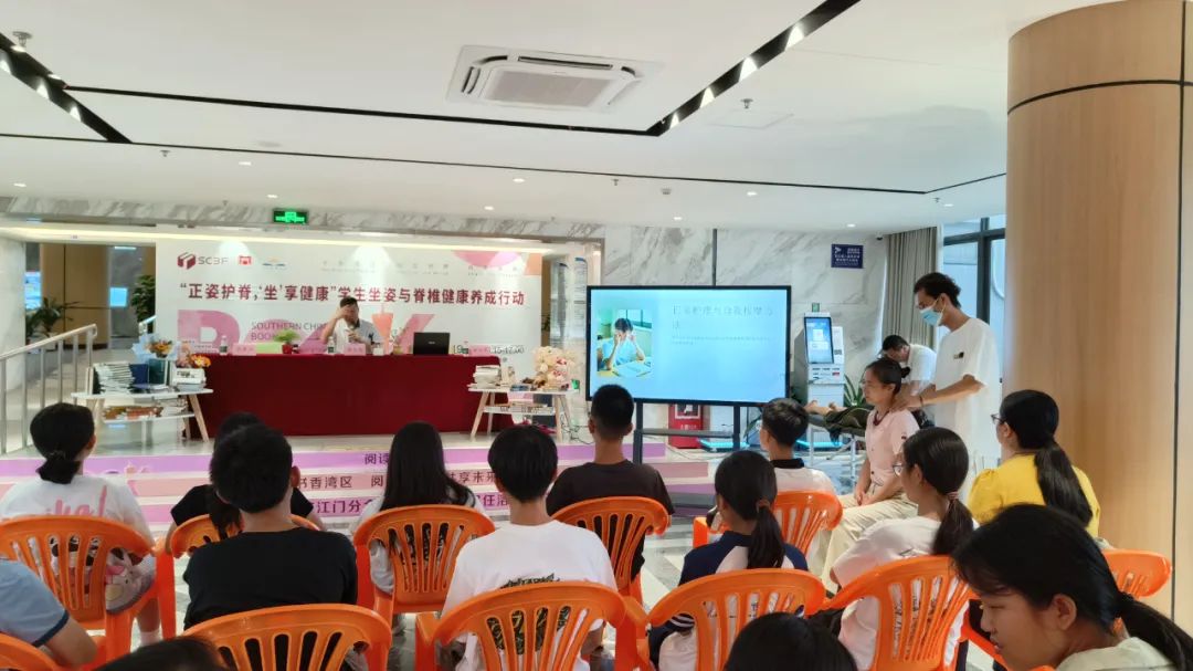 不良阅读姿势、久坐不动、长时间低头玩手机、沉重的书包压力且缺乏体育锻炼和运动,先天性脊柱畸形或骨骼发育异常等因素,这些常被忽略的行为,却如同一个个隐形的杀手,悄悄侵蚀着孩子们的脊柱健康。周老师现场示范了正确的坐姿:背部挺直,肩膀放松,眼睛平视前方。另外,他提醒大家,无论是学习还是工作,都要定时起身活动,避免长时间保持一个姿势。