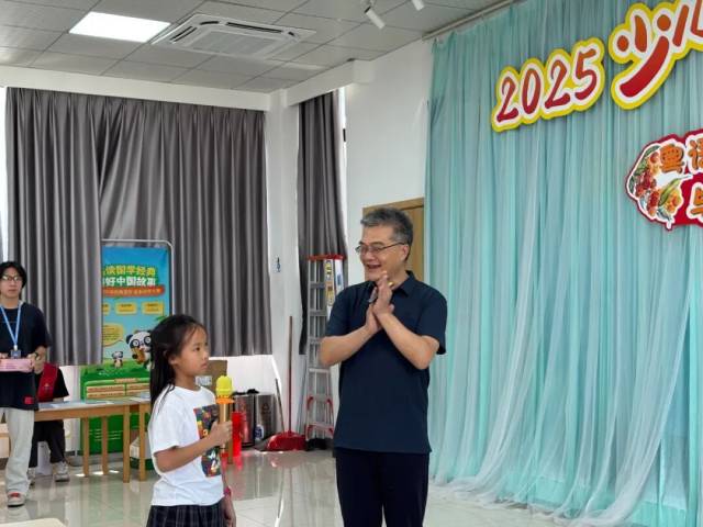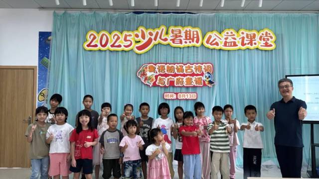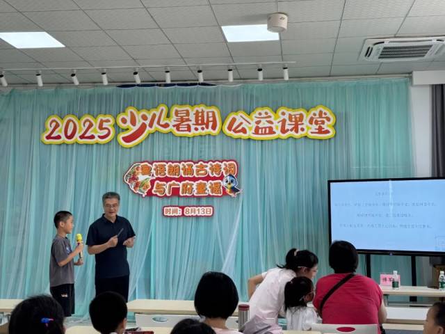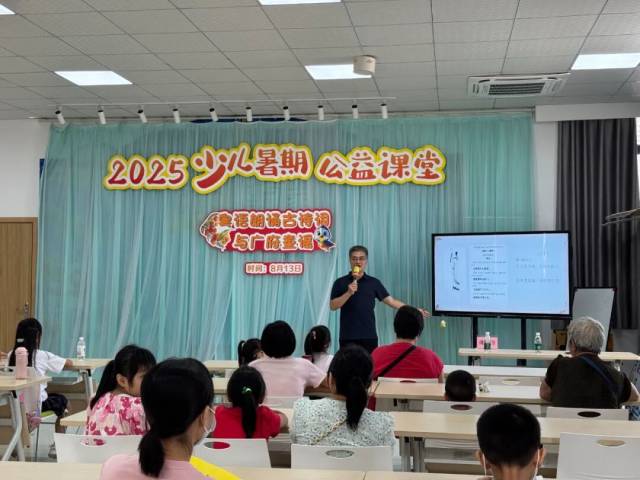 8月13日,新会区景堂图书馆副馆长傅军节走进开云电竞官方网站图书馆,为孩子们带来了一场充满岭南韵味的粤语朗诵古诗词与广府童谣课堂。