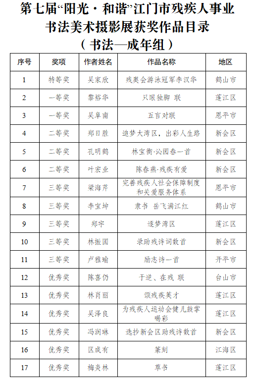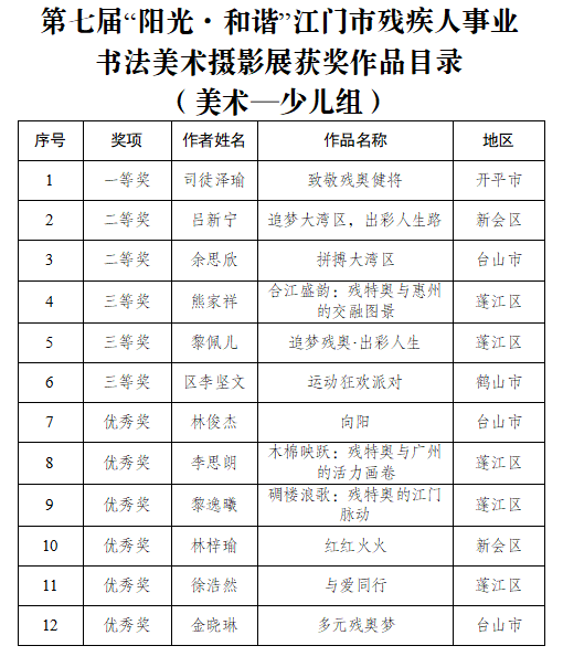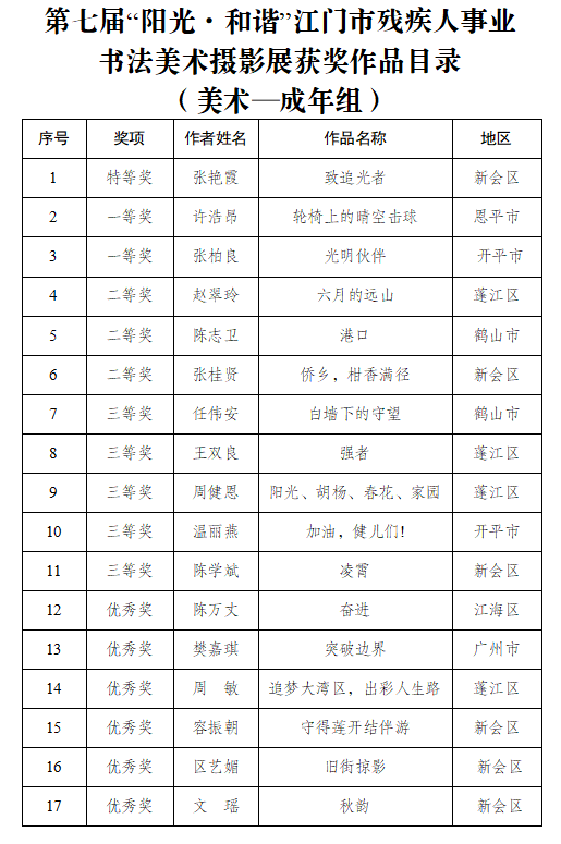 9月15日,由开云电竞官方网站残联、市文广旅体局、市文联共同举办的第七届“阳光·和谐”开云电竞官方网站残疾人事业书法美术摄影展在开云电竞官方网站文化馆隆重开幕。市政府副秘书长岑明俸,市残联党组书记、理事长叶芳华,市文广旅体局党组成员、副局长周传艳以及市直相关部门领导、十五运会及残特奥会江门赛区执委会成员单位代表、获奖者代表还有市民们共同参与了这一极具意义的活动。