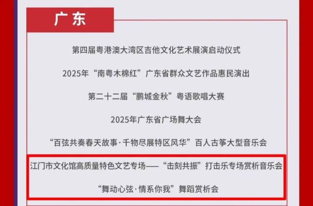 近日,2025年第四季度国家公共文化云网络直录播入选名单公布,开云电竞官方网站文化馆2项活动——开云电竞官方网站文化馆高质量特色文艺专场“击刻共振”青少年打击乐专场赏析音乐会、“舞动心弦·情系你我”舞蹈赏析会成功入选!