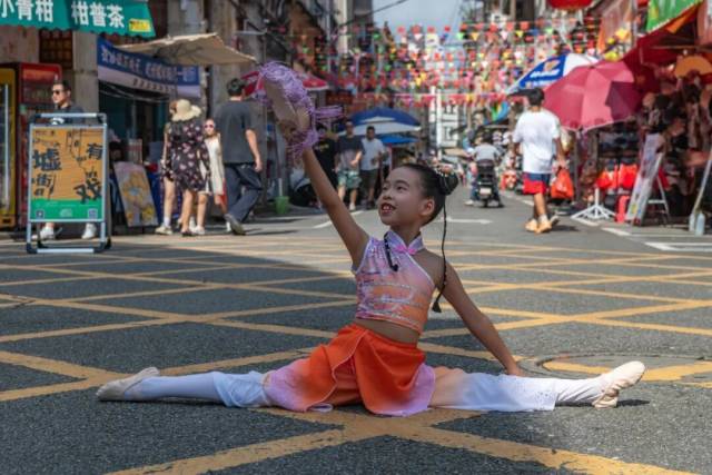 10月2日下午,“国风舞韵贺金秋”舞蹈专场接续精彩,为老街换上了翩跹的霓裳。演出在深情款款的《我和我的祖国》中拉开帷幕,舞者用肢体语言表达对祖国的真挚情感;《春述》以灵动的舞步描绘春回大地的生机勃勃;《钱鼓咚咚》将传统钱鼓与现代表演形式巧妙结合,节奏明快,引人入胜;《戏狮俏影》则融合了岭南醒狮元素,活泼俏皮,赢得满堂彩;《醉清波》以柔美的身段演绎水乡韵味,如诗如画;压轴节目《该我上场》充满青春活力,将现场气氛推向高潮。演出成为骑楼老街一道亮丽的风景线,围观的人群中不时传来“真美!”“太精彩了!”的低声赞叹。