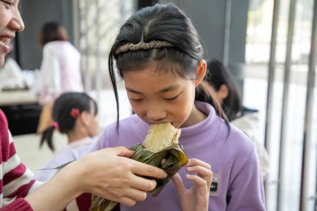 家长与孩子们在老师的带领下,了解龙口柴火粽制作技艺的相关知识。