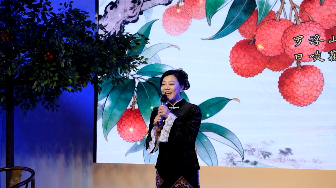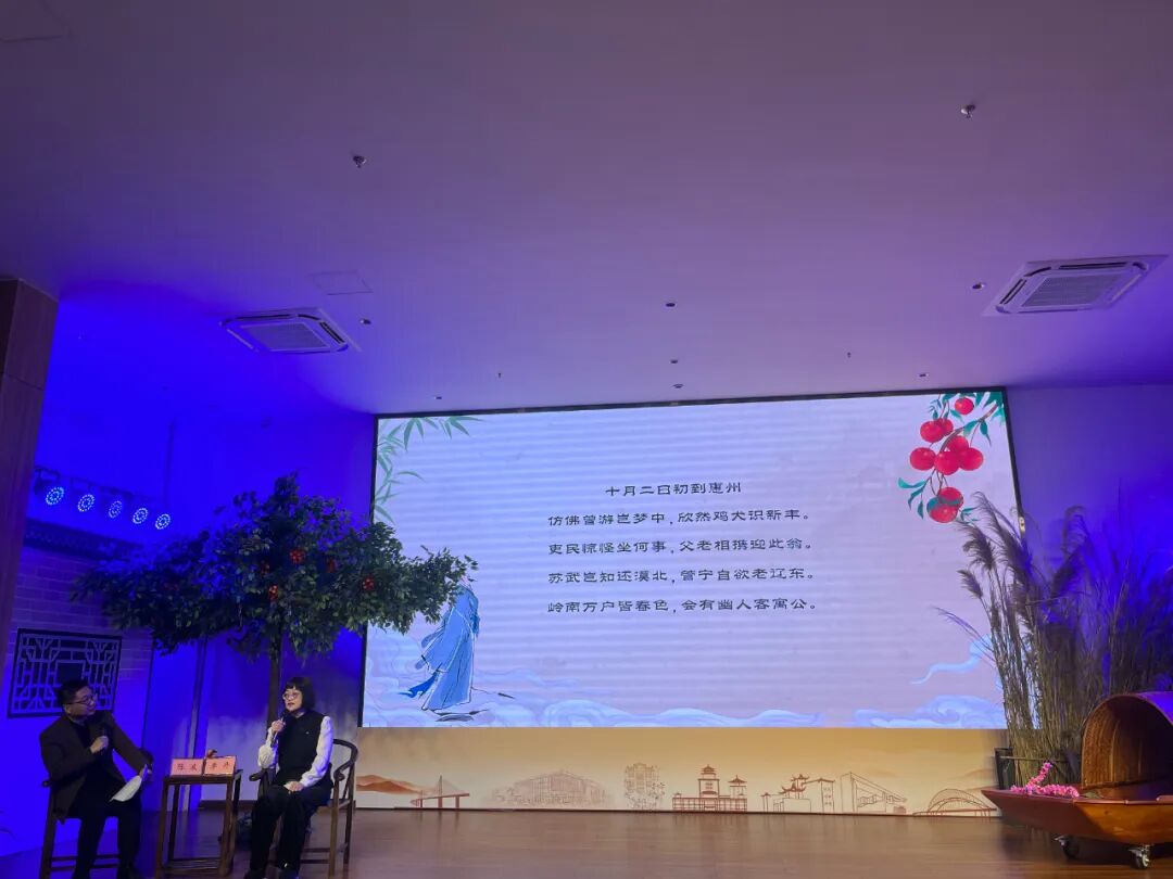 随着话题南移,现场氛围转入惠州阶段。李丹教授从《四月十一日初食荔枝》入手,生动分析了诗中“海山仙人绛罗襦”的惊艳比喻,以及“日啖荔枝三百颗,不辞长作岭南人”这句看似玩笑的话语背后,所蕴含的彻底接纳与随遇而安的人生态度。粤语朗诵的加入,让苏轼在惠州的形象愈发鲜活。