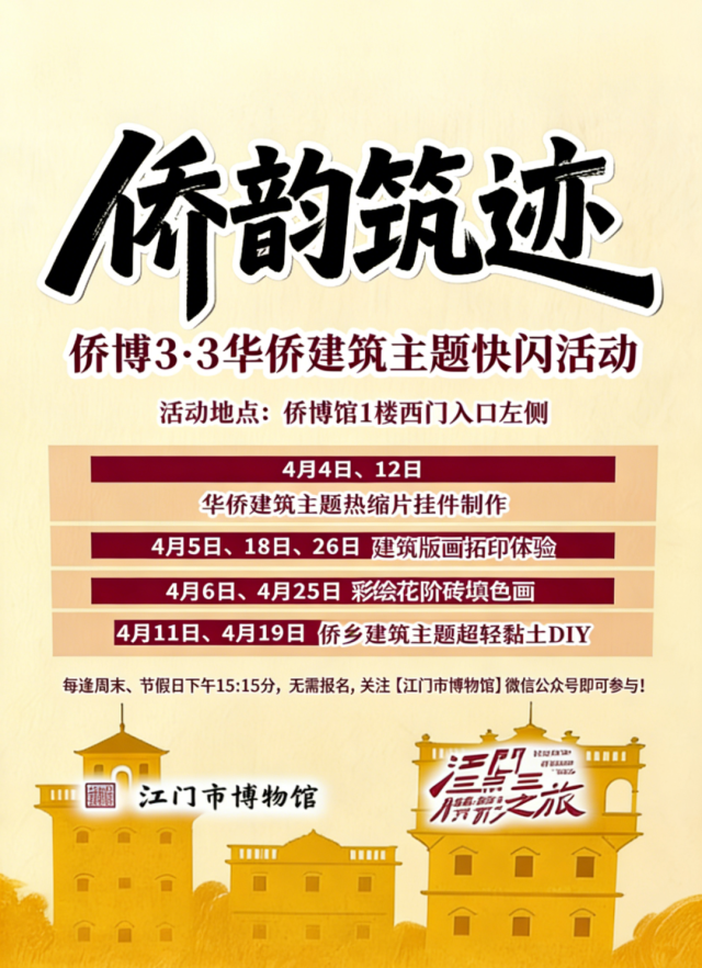 无需复杂报名,无需额外费用,每逢周末、节假日15:15,关注【开云电竞官方网站博物馆】微信公众号,即可走进博物馆,一边解锁华侨建筑的百年底蕴,一边亲手创作专属侨韵手作,让建筑之美、侨乡之情,定格在指尖时光里。