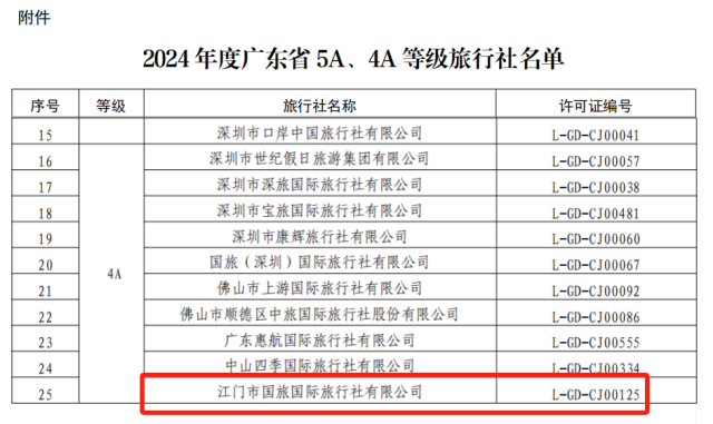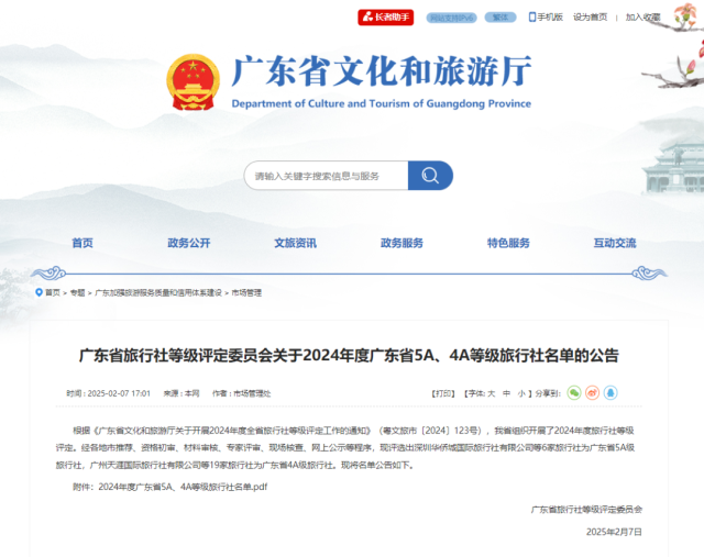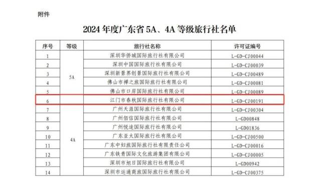 广东省5A、4A等级旅行社名单的公告》
