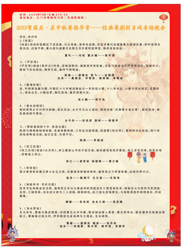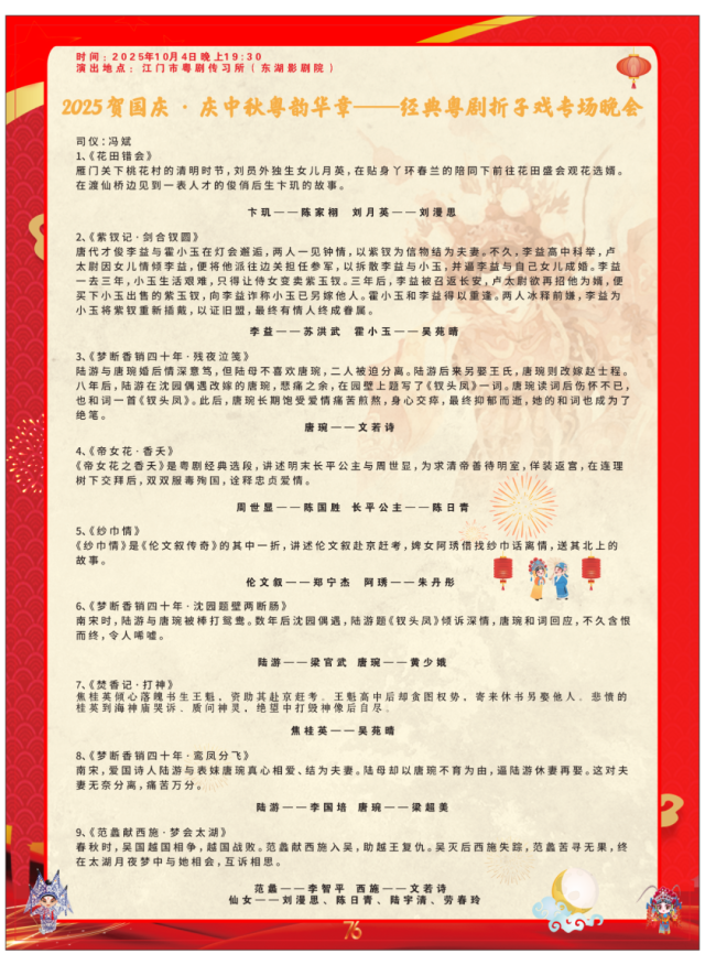 2025年10月5日晚上19:30,本场晚会充满欢乐与惊喜。《四大才子会美人》通过四大才子与四大美人的穿越相遇,以幽默诙谐的方式展现五邑侨乡文化,潘海东、陈海宁等演员将为您带来一场别具一格的视听盛宴。《七姑奶开店》剧情反转,冯斌饰演的七姑奶性格鲜明,与李智平饰演的张秀才共同演绎这段充满戏剧性的故事。还有《花田喜事》等轻松有趣的剧目,让您在欢笑中度过一个愉快的夜晚。