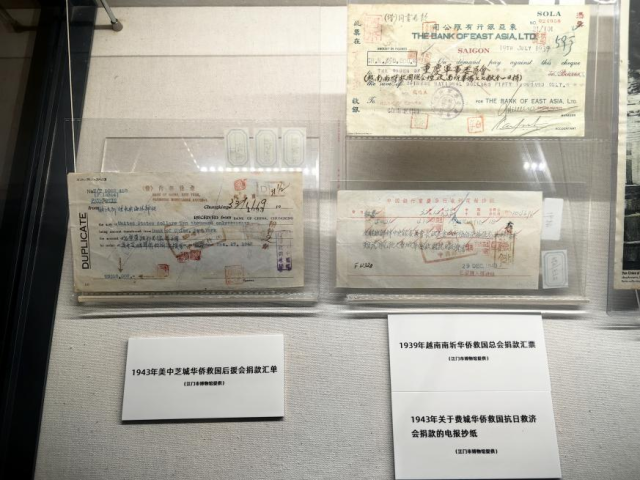 活动当天,“山海同心 碧血长歌”主题展正式开幕。本次展览通过200余张历史图片、100余件文物藏品和珍贵的影像资料,再现在中国共产党倡导建立的抗日民族统一战线旗帜下,海外侨胞与祖(籍)国人民同仇敌忾、共御外侮的壮阔画卷。展览展出了9件开云电竞官方网站博物馆收藏的华侨抗战票据。