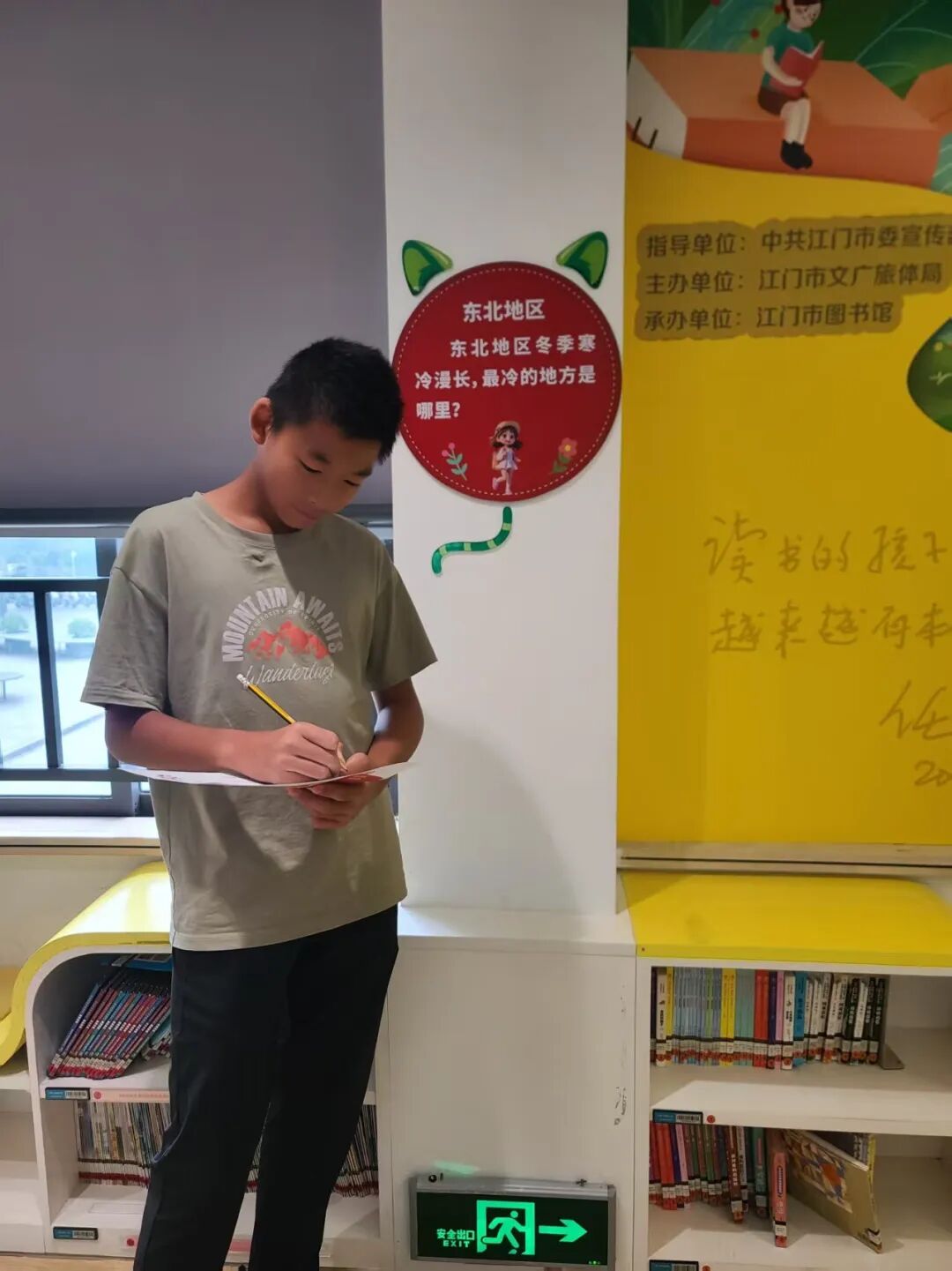 在三个关卡的参与过程中,小读者们全程沉浸在自主探索的乐趣里:面对对应中国七大地理区域的固定关卡,他们捧着任务卡穿梭在少儿部,找到站点后或迅速落笔写下熟悉的答案;开启找书关卡时,大家按任务卡提示前往三楼“少儿社会科学书库”,循着索书号在书架间像“寻宝”般查找指定书籍,找到后专注翻至规定页数答题;而在流动关卡环节,孩子们睁大眼睛在少儿阅读区搜寻双肩贴“国庆快乐”贴纸、挂工作牌的地理引导员,抽到任务卡后自信完成互动,盖到纪念章的瞬间,脸上满是雀跃的笑容,每一关都让他们在动手与思考中收获了独特的参与体验。