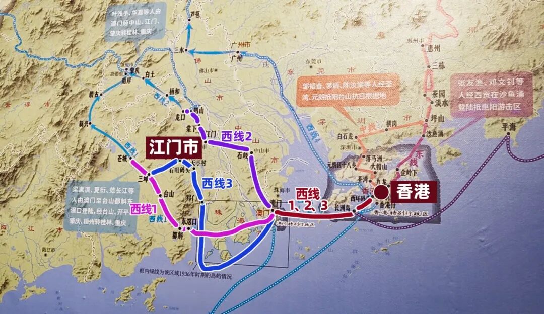 中国文化名人大营救路线中,江门三条路线示意图