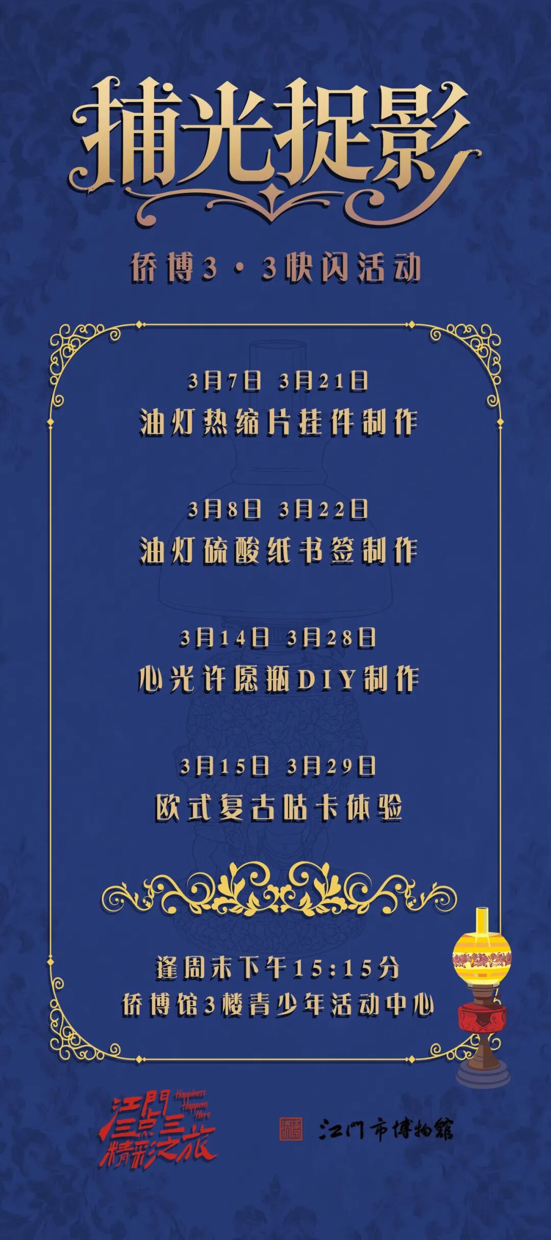 精彩活动,无需预约!这个3月,每逢周末下午15:15分,前往侨博馆三楼青少年活动中心即可体验,名额每日限量,先到先得!(注:活动地点可能根据现场情况变更)